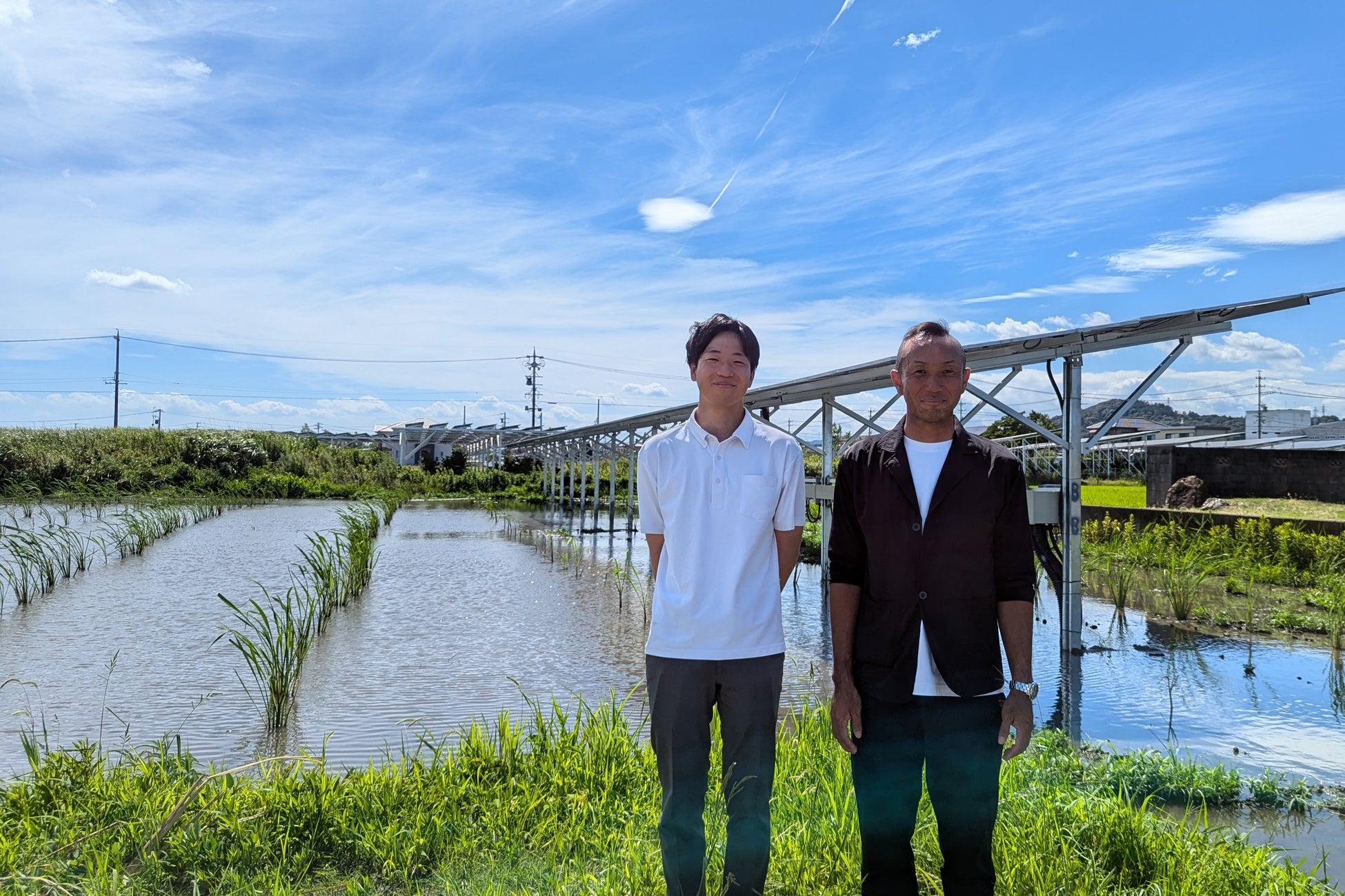 浜松マコモダケ発電所を背景に、オーナーのスマートブルー株式会社さま。【右】再エネ推進事業部 取締役COO 尾村豊さま【左】再エネ推進事業部 アグリビジネス課 加嶋優也さま