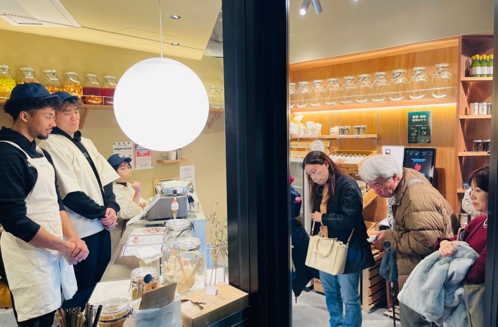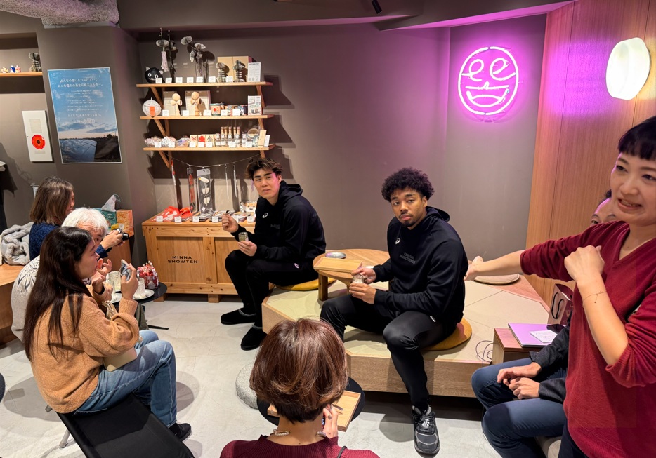 店舗前で受付を済ませた参加者の方がまず入ったのは、みんな商店1階の発酵スイーツショップ。そこで参加者をお出迎えするのは、お揃いのエプロンに帽子姿の野本選手、ロイ選手。