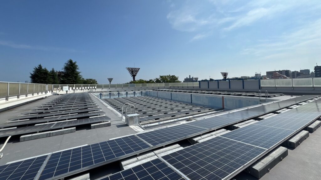 世田谷区池尻にある複合施設「HOME/WORK VILLAGE」は、旧池尻中学校をリノベーションして誕生した地域拠点です。その屋上プール跡地を活用し、株式会社UPDATERは都市型太陽光発電所を整備しました。かつて生徒が泳いだプールが、今では区民の暮らしを支える再生可能エネルギーの拠点へと生まれ変わっています。