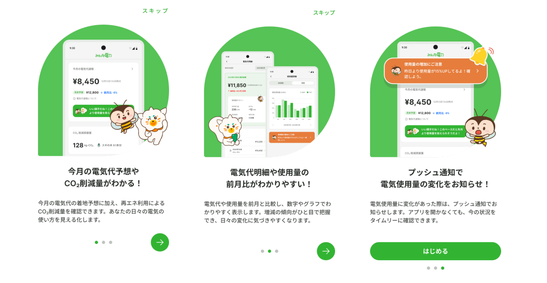使用量の増加や電気料金の確定を通知することで、自身の電気使用の変化に気づくきっかけを提供し、日々の生活の中で電気との向き合い方を見直すことができます。