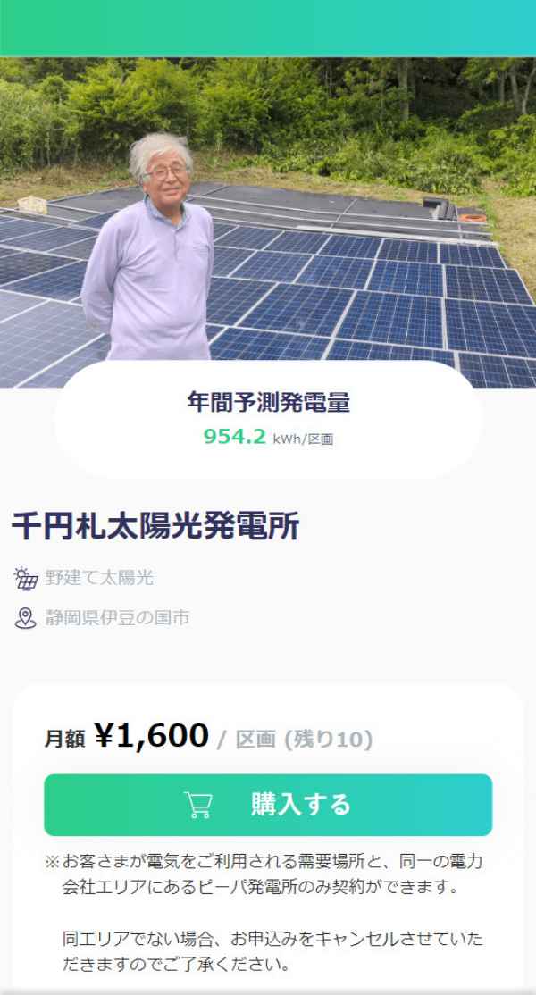 - 発電所建設をするための土地も屋根も必要ない。電気を使用する需要場所が、ピーパ発電所の販売エリアに存在していれば遠隔で利用できる!