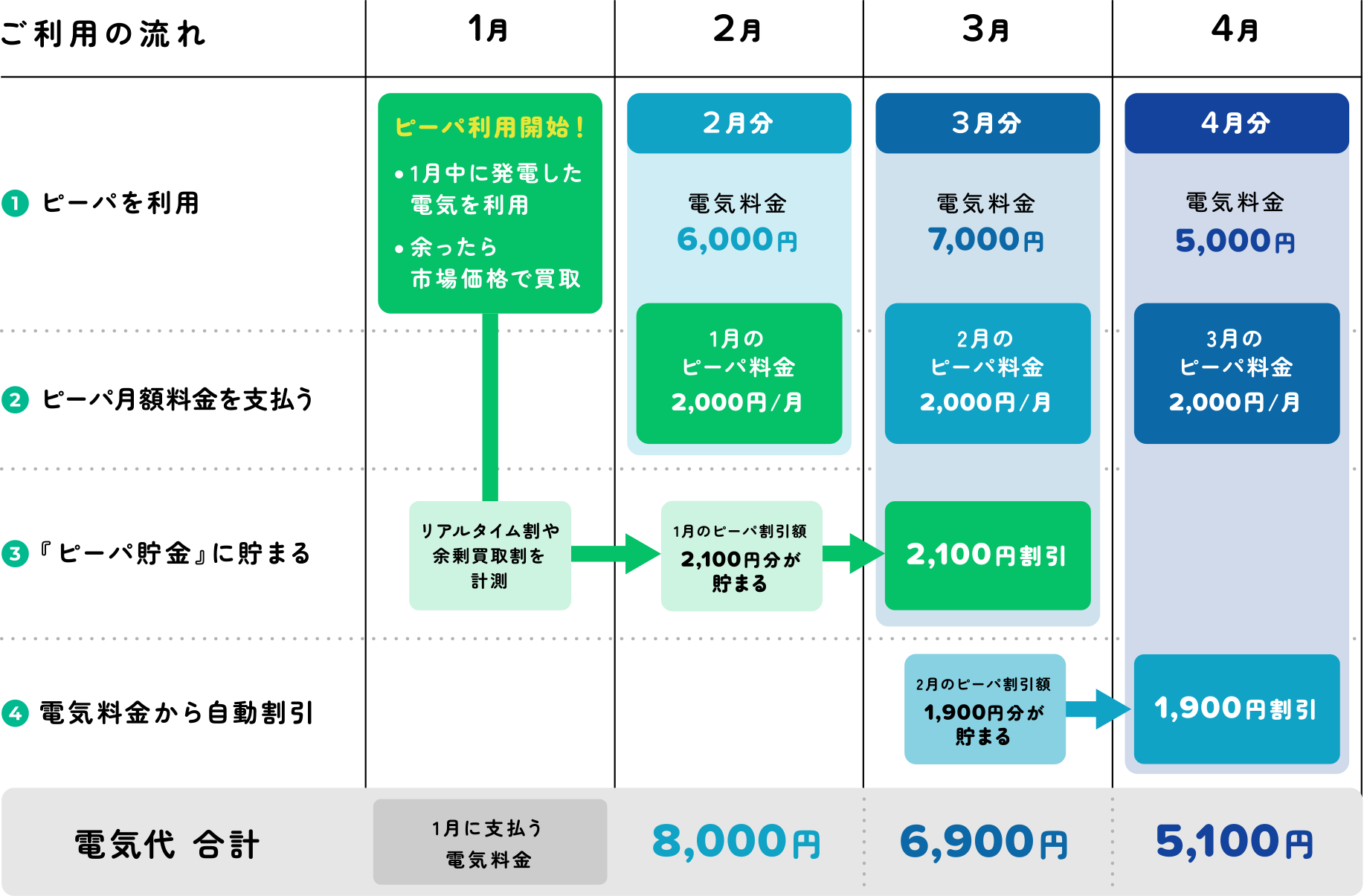 - ・『ピーパ貯金』に貯まり、電気料金から自動割引されます。