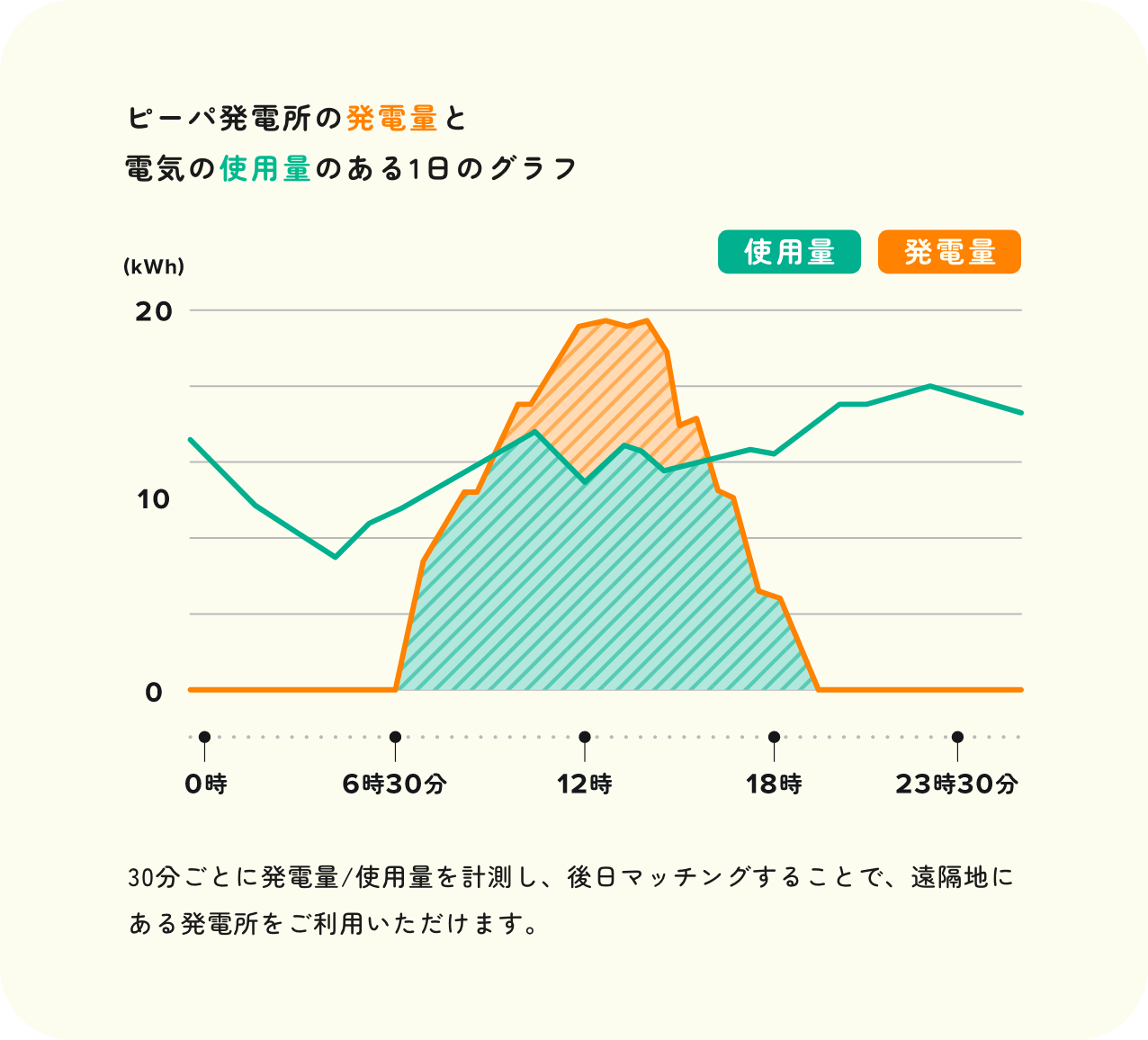 ピーパはお客さまが契約している発電所で作られた電気をご自身で使えるサービスです。それ以外の電気は、今まで通りご利用いただいている電力プランをご利用いただきます。